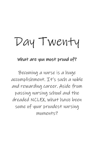 Day Twenty What are you most proud of? Becoming a nurse is a huge accomplishment. It’s such a noble and rewarding career. Aside from passing nursing school and the dreaded NCLEX, what have been some of your proudest nursing moments?