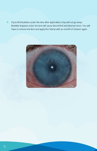 5. If you find bubbles under the lens after application, they will not go away. Bubbles trapped under the lens will cause discomfort and blurred vision. You will have to remove the lens and apply the Scleral with an overfill of solution again. 3
